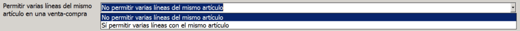 Aquí escogeremos si queremos, o no, que el programa nos permita introducir dos líneas distintas en una venta o compra para el mismo artículo. Lo más aconsejable es que escojas No permitir varias líneas del mismo artículo e introduzcas correctamente la cantidad de cada artículo en lugar de duplicarlo. No obstante, si por alguna razón necesitas trabajar con varias líneas del mismo artículo puedes hacerlo. Eso sí, ten en cuenta que trabajar así puede repercutir en cómo se realizan los movimientos de almacén y generar confusiones.