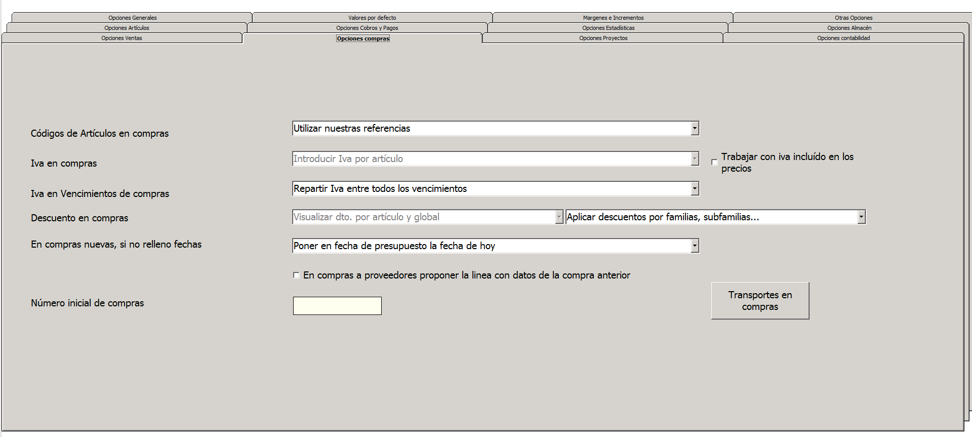 Vamos a ver con más detenimiento las opciones que tenemos para configurar los parámetros de compras.