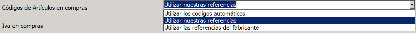 Aquí escogeríamos qué referencia queremos que aparezca en compras en las distintas líneas, a escoger entre los códigos automáticos generados por el programa, nuestras referencias o las referencias del fabricante.