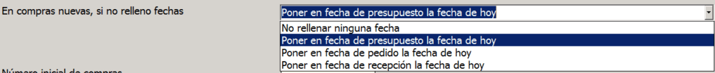 Podemos decirle «No rellenar ninguna fecha» si queremos rellenar todas nosotros manualmente. Si no, puedes escoger entre poner o en la fecha de presupuesto, o en la de pedido o en la recepción, la fecha de hoy.