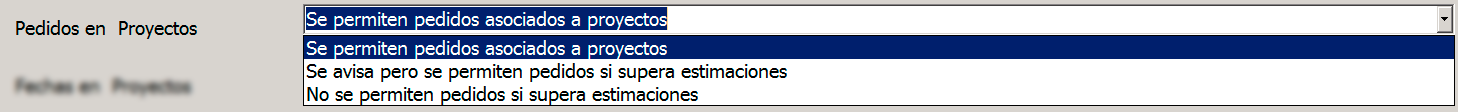 Esta opción te permite configurar qué quieres que haga el programa cuando imputas un pedido de compra a un proyecto y se superan las estimaciones de costes. Puedes escoger «Se permiten pedidos asociados a proyectos» para que te permita imputar pedidos de compra sin emitir ningún aviso; «Se avisa pero se permiten pedidos si supera estimaciones«, que te permitirá imputar pedidos de compra a proyectos aunque se superen estimaciones pero te avisará de ello; o «No se permiten pedidos si supera estimaciones«, que no te dejará imputar un pedido de compra a un proyecto en el cual hemos superado los costes estimados.