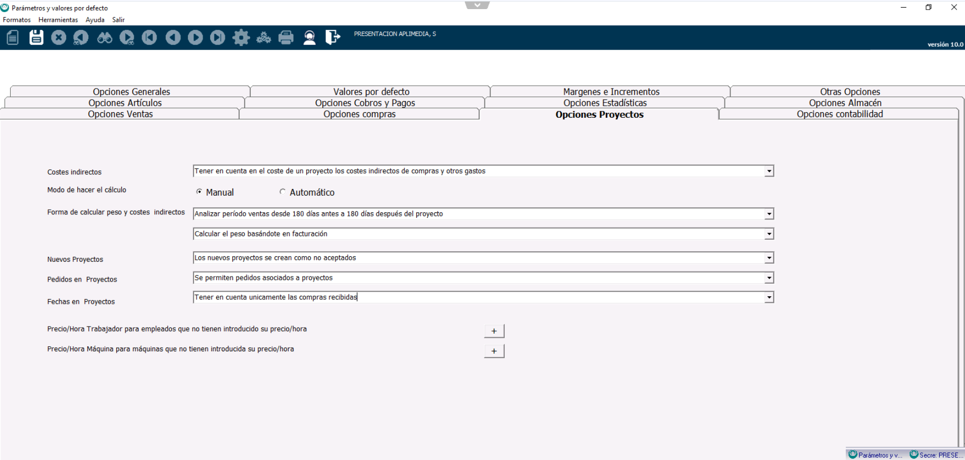 Aquí podemos introducir el precio/hora para trabajadores y máquinas para los cuales no hemos introducido ningún coste/hora particular.