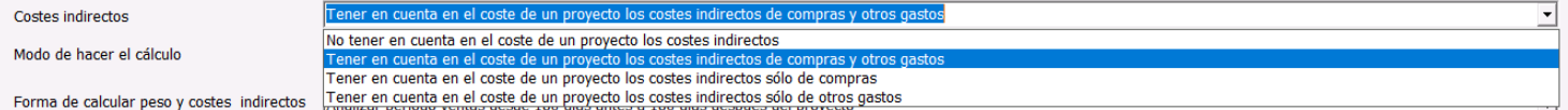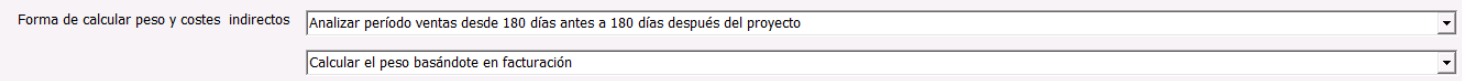 - Forma de calcular peso y costes indirectos: aquí tenemos dos desplegables. En el primero elegiremos cuál será el periodo a analizar para realizar el cálculo de los costes indirectos. En el segundo, elegiremos de qué manera distribuir el peso de cada proyecto y, por tanto, repartir los costes.