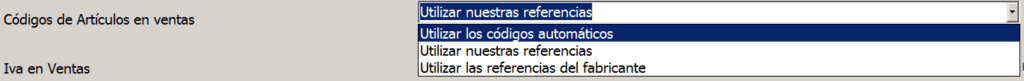 Aquí escogeríamos qué referencia queremos que aparezca en ventas a la izquierda de las distintas líneas, a escoger entre los códigos automáticos generados por el programa, nuestras referencias o las referencias del fabricante.