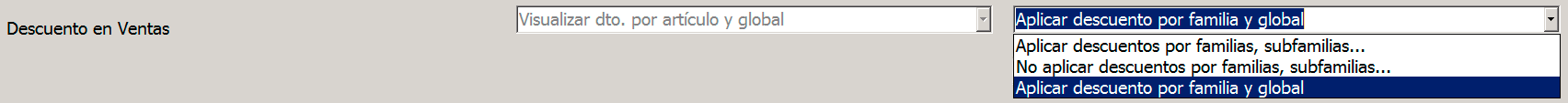La opción «Visualizar descuento por artículo y global» no se puede modificar, solo se mantiene por versiones antiguas del programa que permitían escoger entre visualizar el descuento solamente por artículo o solamente global.