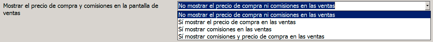 Estas opciones influyen en la información que veremos en la pantalla de ventas en referencia al precio de compra y las comisiones de dicha venta. Podemos escoger que no aparezca ninguno de estos dos datos (estos datos los tenemos siempre accesibles desde el menú superior de ventas), que sí aparezcan ambos, que aparezca uno u el otro.