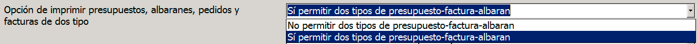 Por defecto estára como «Sí permitir dos tipos de presupuesto-factura-albarán«, lo cual hará que, cuando tratamos de imprimir uno de estos documentos nos deje elegir entre distintos tipos de formato.