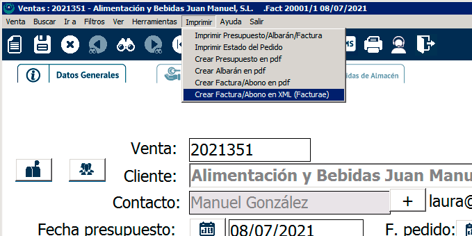Por último, para generar el XML, desde la venta ve a Imprimir>Crear Factura/Abono en XML (FacturaE).
