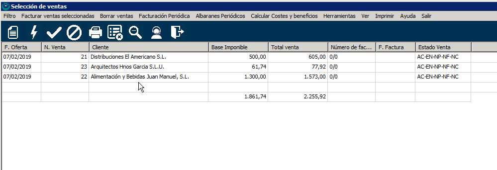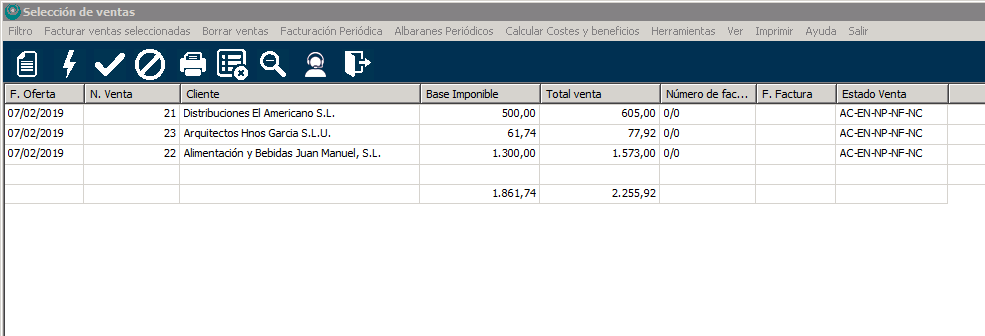 Si hubiera alguna venta de esa lista que no quieres facturar puedes sacarla del listado haciendo click sobre ella y luego en el icono de la barra superior «Eliminar de la lista».