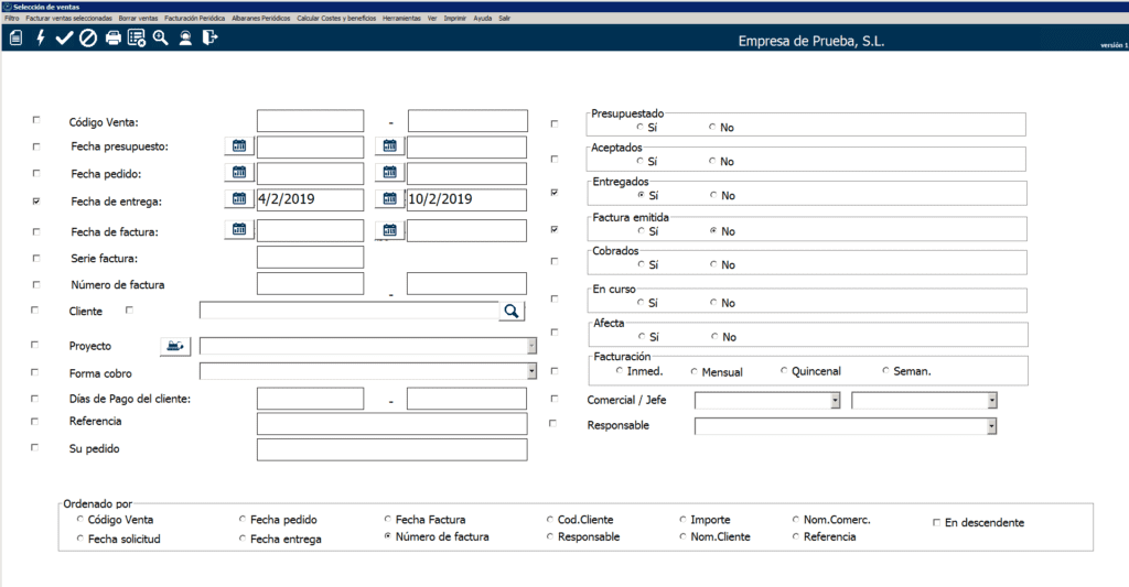 A continuación, deberemos escoger los criterios para sacar el listado de ventas a facturar. Por supuesto, el requisito es que dichas ventas no estén facturadas, para lo cual deberás marcar la opción «No» en «Factura emitida«.