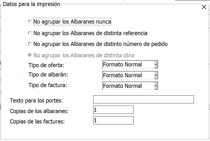 Por otro lado, debes saber que puedes configurar cómo Secre agrupa las facturas de cada cliente desde su ficha. Para ello, desde la ficha de dicho cliente, navega a Ver>Datos para la impresión, en esta pantalla podrás configurar la agrupación de las facturas como necesites: