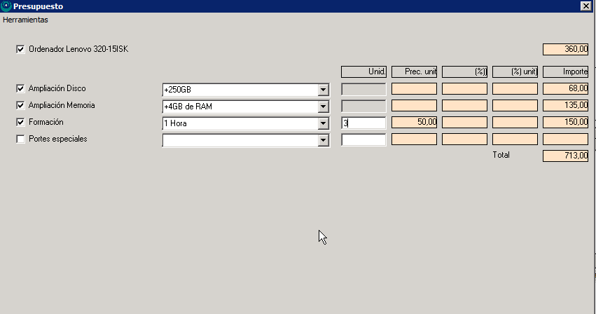 Por ejemplo, digamos que vendes ordenadores. Podría darse el caso de que el presupuesto para cada ordenador dependa de las características escogidas: memoria RAM extra, tamaño del disco, horas de formación… Si introducimos en nuestra base de datos el importe extra que suponen esas condiciones podremos hacer presupuestos de forma más rápida.