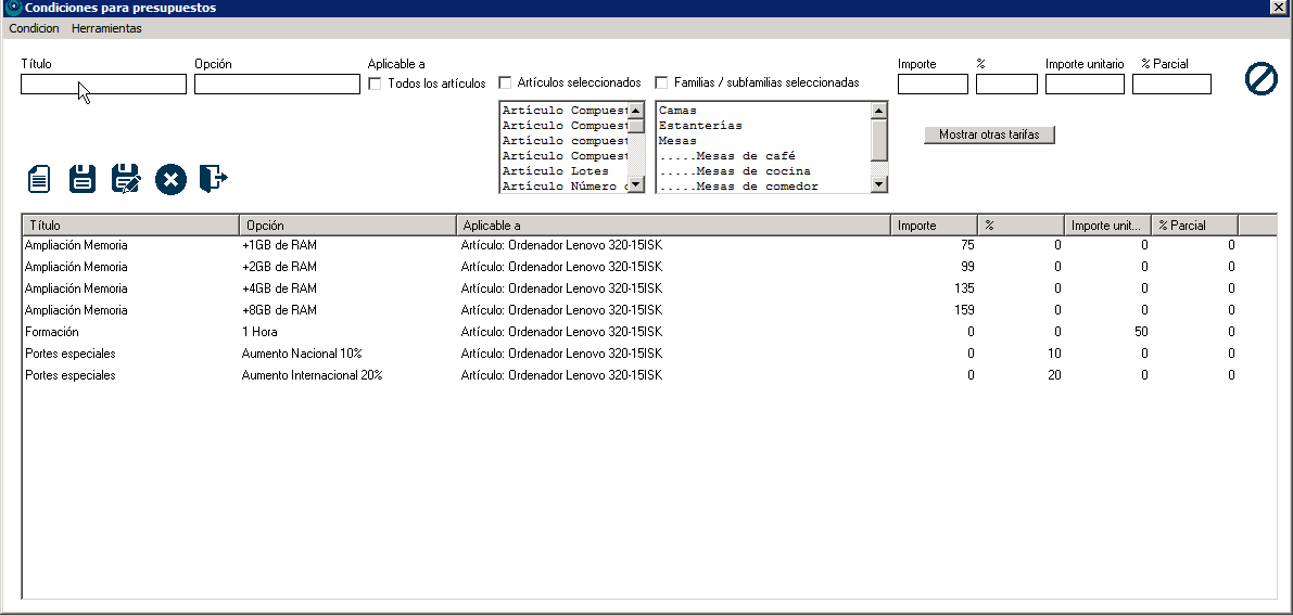 Seguiríamos estos mismos pasos para crear todas nuestras condiciones y, de esta manera, ya las tendríamos disponibles para utilizar a la hora de hacer presupuestos, de la manera que hemos visto en la primera parte de este tutorial.