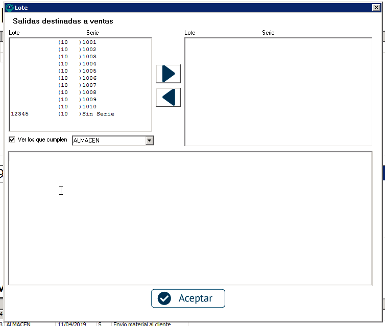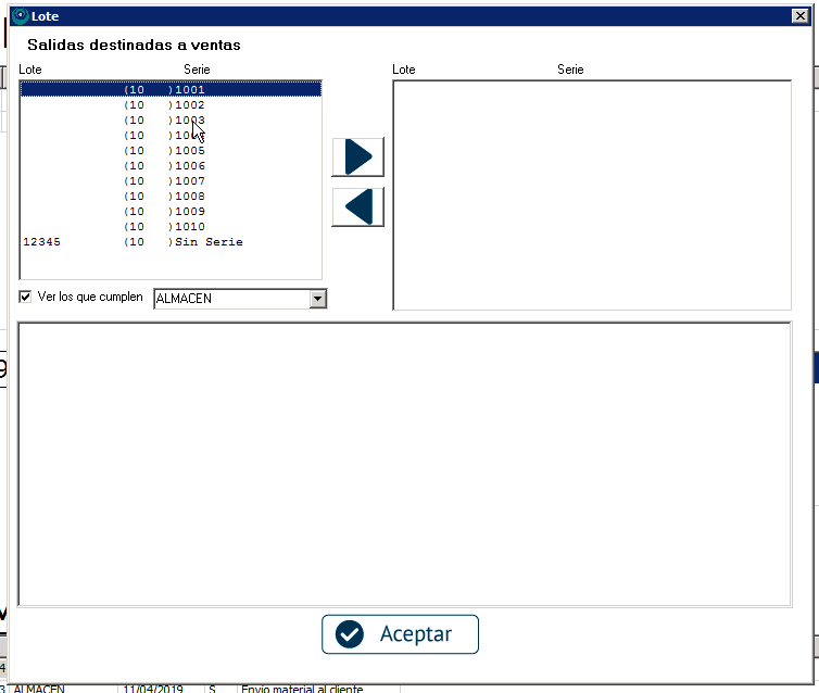 En la parte izquierda de la pantalla veremos los números de serie o lotes que tengamos disponibles para el artículo. En el caso de números de serie seleccionaremos todos los que correspondan seleccionándolos y salvándolos con la flecha que apunta a la derecha. Puedes ir uno a uno o seleccionar varios manteniendo pulsada la tecla Ctrl.