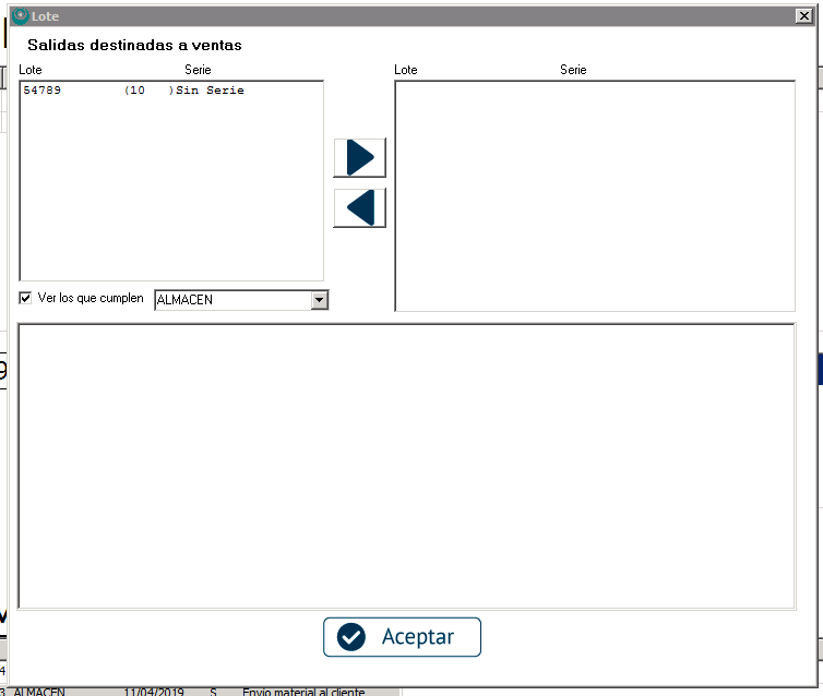Para lotes el funcionamiento es el mismo, seleccionamos de la izquierda de qué lote sale esa venta y hacemos click en la flecha hacia la derecha para guardarlo. Después, pinchamos en «Aceptar».