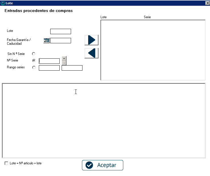 Al igual que con los números de serie, también puedes introducir manualmente un lote que no tuvieras registrado en el programa, desmarcando la casilla «Ver los que cumplen».