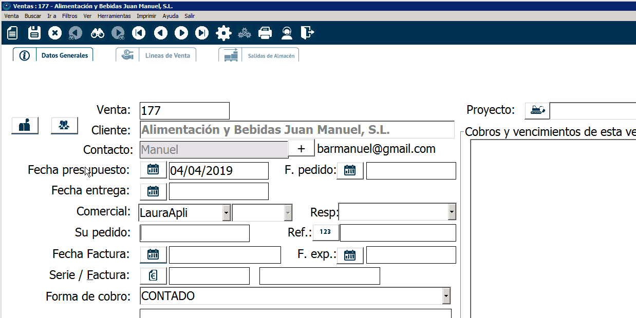 La dirección de entrega podemos seleccionarla fácilmente en el icono del buzón que visualizarás solo en los clientes con más de una dirección a los que crees una venta. Este icono se encuentra a la izquierda del campo Cliente.