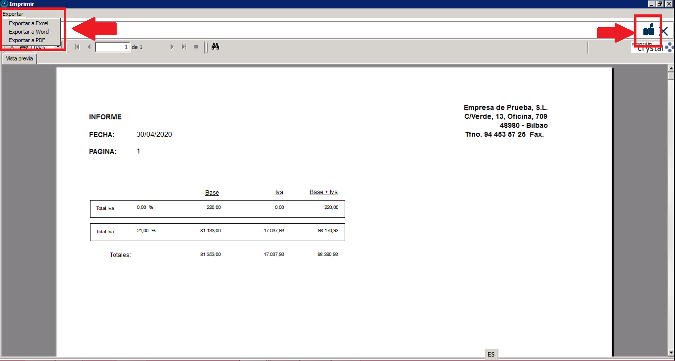 También puedes hacer click en el icono de la impresora en la parte superior izquierda de la previsualización, para imprimir el documento:
