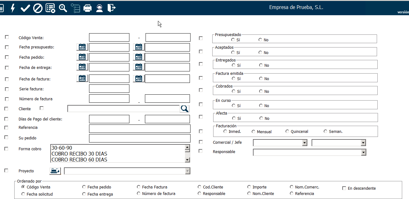 Lo habitual es sacar un listado de facturas del trimestre, así que, en este ejemplo, vamos a hacer un filtro para sacar un listado de todas las facturas del primer trimestre del año. Para ello usaremos la opción del filtro «Fecha factura» para introducir el intervalo de fechas. Después ejecutaremos el filtro haciendo clic en el icono del rayo.