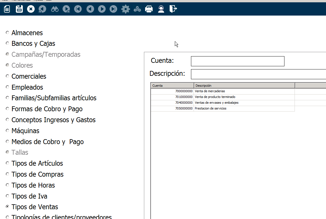 En este caso vamos a ver cómo crear Tipos de Ventas, pero los pasos son exactamente los mismos en Tipos de Compras.