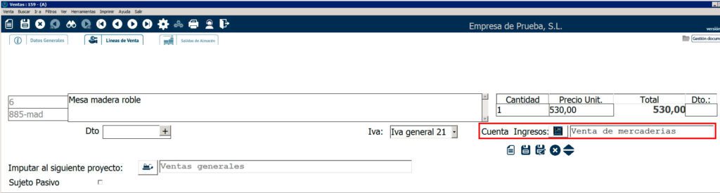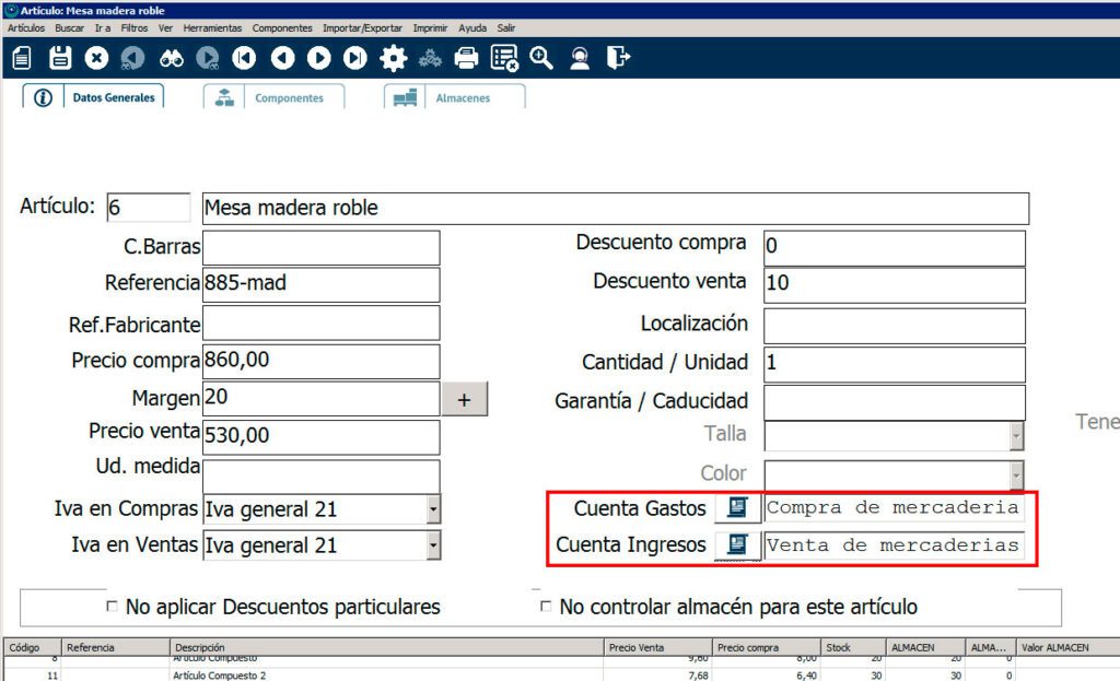 Por defecto, la cuenta contable de ingresos y de gastos se cogerá de la que hayas establecido para ese artículo a la hora de darlo de alta en el módulo de Artículos y Servicios. La Cuenta de Gastos es la que aparecerá en compras y la Cuenta de Ingresos, en ventas: