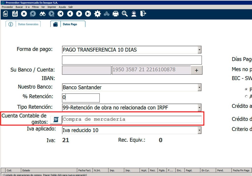 Si en la ficha del artículo tuviéramos estos campos vacíos, el programa cogería la cuenta contable que hubiéramos especificado en la ficha del proveedor o del cliente para el que estamos creando la compra o la venta: