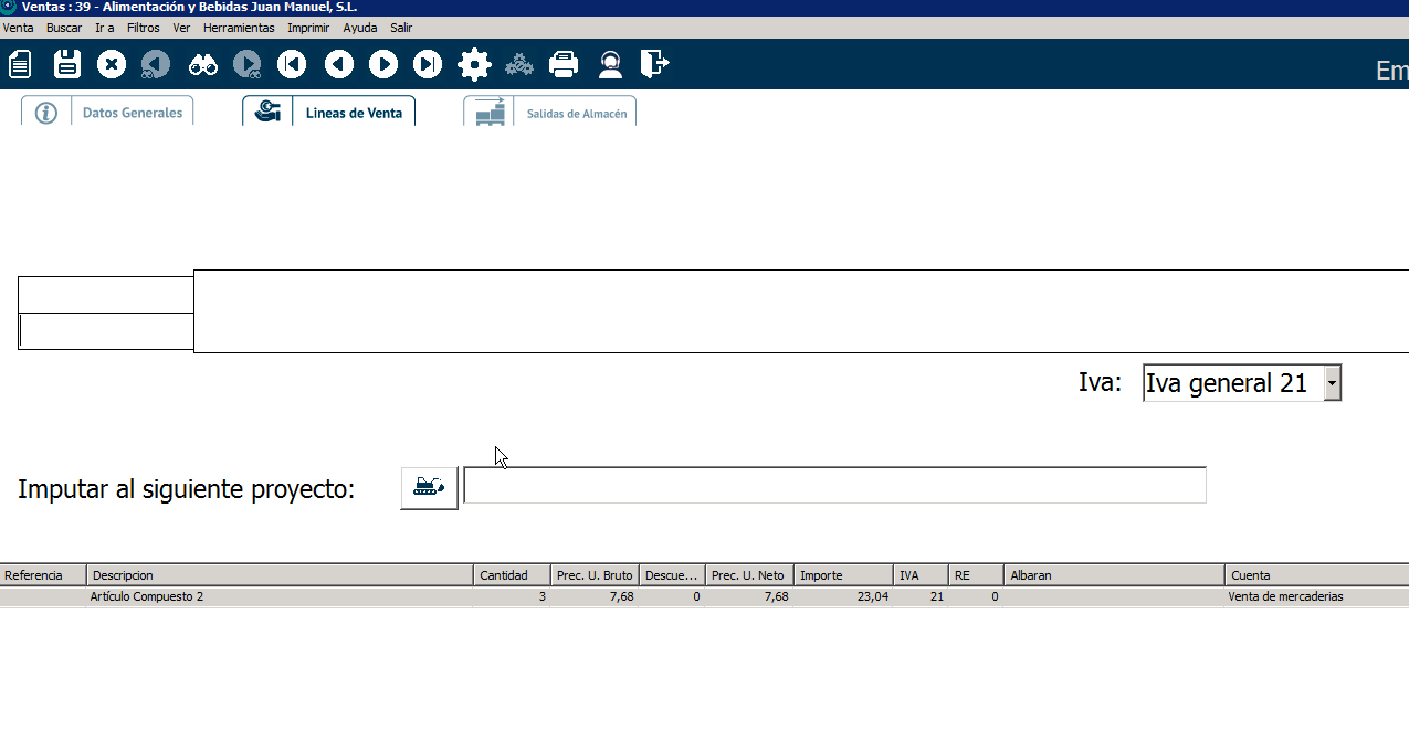 Los pasos para crear una venta directa de un artículo compuesto son los mismos que para cualquier otra venta: añadiríamos, en Líneas de venta, los artículos compuestos dados de alta en nuestra base de datos que vayamos a vender. Y