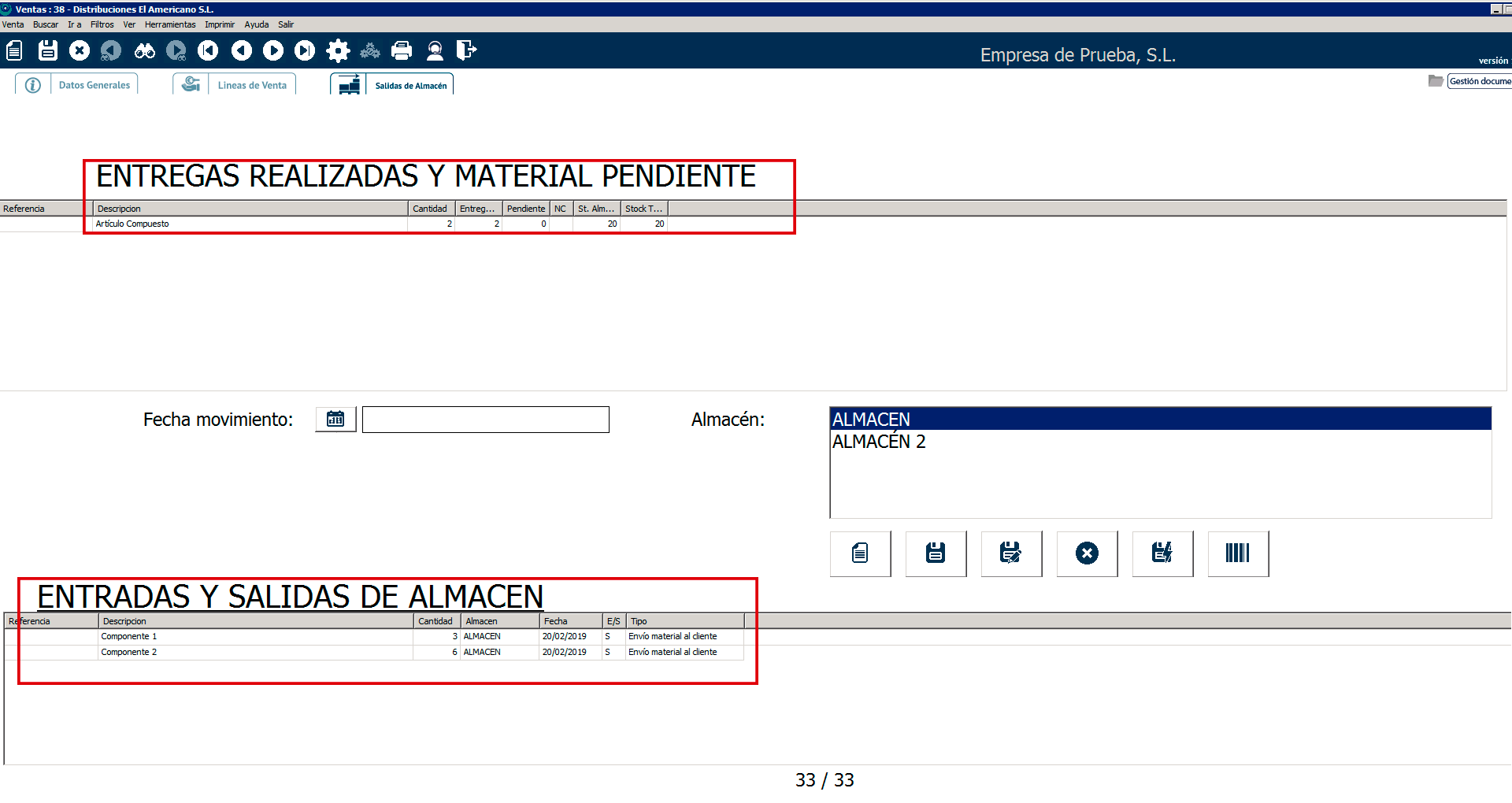 Supongamos que lo dejamos configurado para que nos pregunte a qué queremos dar salida. Si le decimos que sí queremos dar salida a los componentes del artículo, en la pestaña «Salidas de Almacén» nos va a mostrar como material a entregar el artículo compuesto, pero abajo, en las salidas de almacén, nos mostrará la salida de cada uno de los componentes.