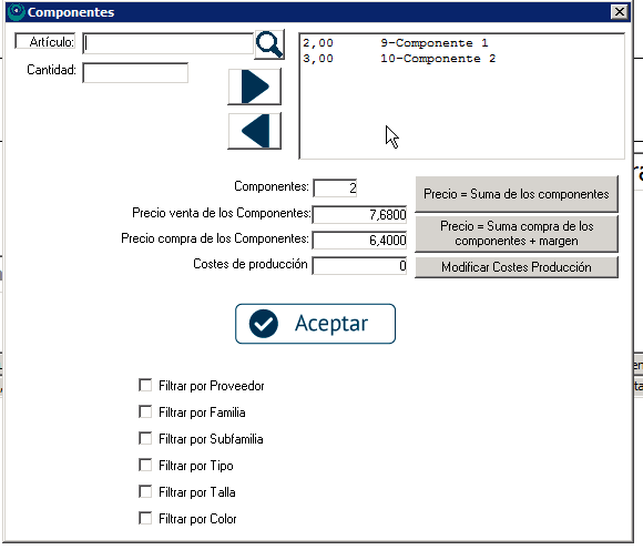 - Ventas: No avisar y descontar los componentes, Compras: No avisar y añadir los artículos compuestos