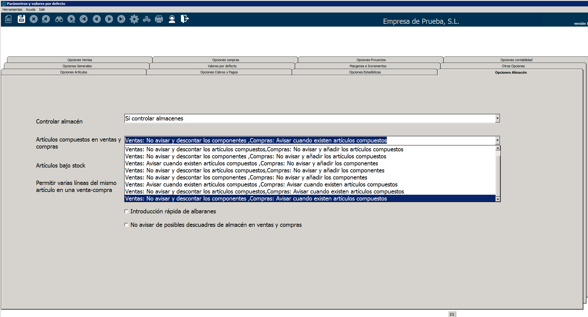 - Ventas: No avisar y descontar los artículos compuestos, Compras: No avisar y añadir los componentes