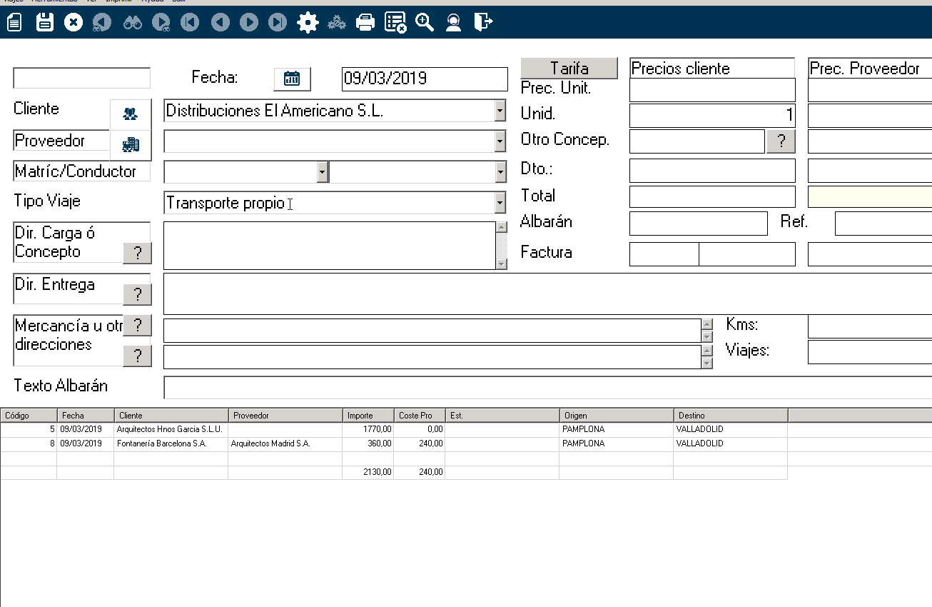 Seleccionamos el cliente y, si procede, el proveedor. Si se trata de transporte propio no tendrás que seleccionar proveedor.